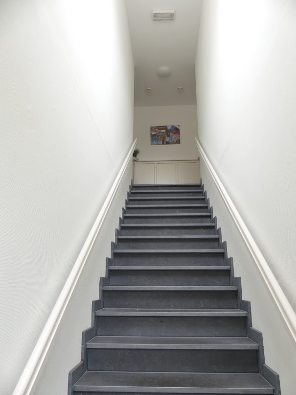 5. Het eindresultaat, trappenhuis voorzien van natuurstenen trap met aan elke kant een “sleutelgat” leuning.
