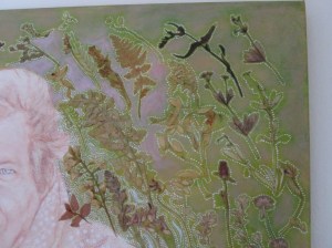 De vriendin van mijn broer maakte een portret van hem. Door de achtergrond zo te maken als zij dat deed, zette ze mijn broer neer met wat iets heel waardevols is in zijn bestaan. Het is namelijk zijn lust en zijn leven om tijdens natuurwandelingen overal (zeldzame) planten te ontdekken, andere planten te determineren, de vindplaatsen vast te leggen. Hij fungeert als contactpersoon met een overkoepelende instantie in Leiden, die het plantenbestand in Nederland in kaart brengt. Mijn broer is een fenomeen, een klein groen sprietje brengt hem in vervoering. Wandelen met mijn broer is een heel aparte ervaring. Hij ziet details, waar ik zo aan voorbij zou lopen. Op het fotodetail van het portret van mijn broer is de achtergrond gemaakt van echte planten. (Stuur een foto )