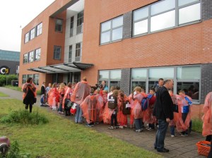 Allemaal (3400 kinderen) in oranje regencapes, met de instrumenten op weg naar de Heineken Music Hall