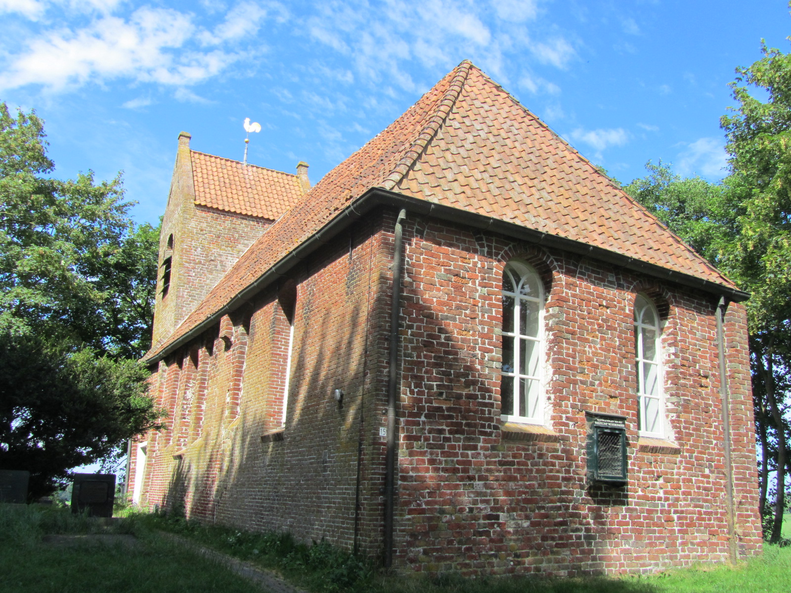 Bij Ezinghe staat de kerk en de toren hoog aan de rand van het dorp.