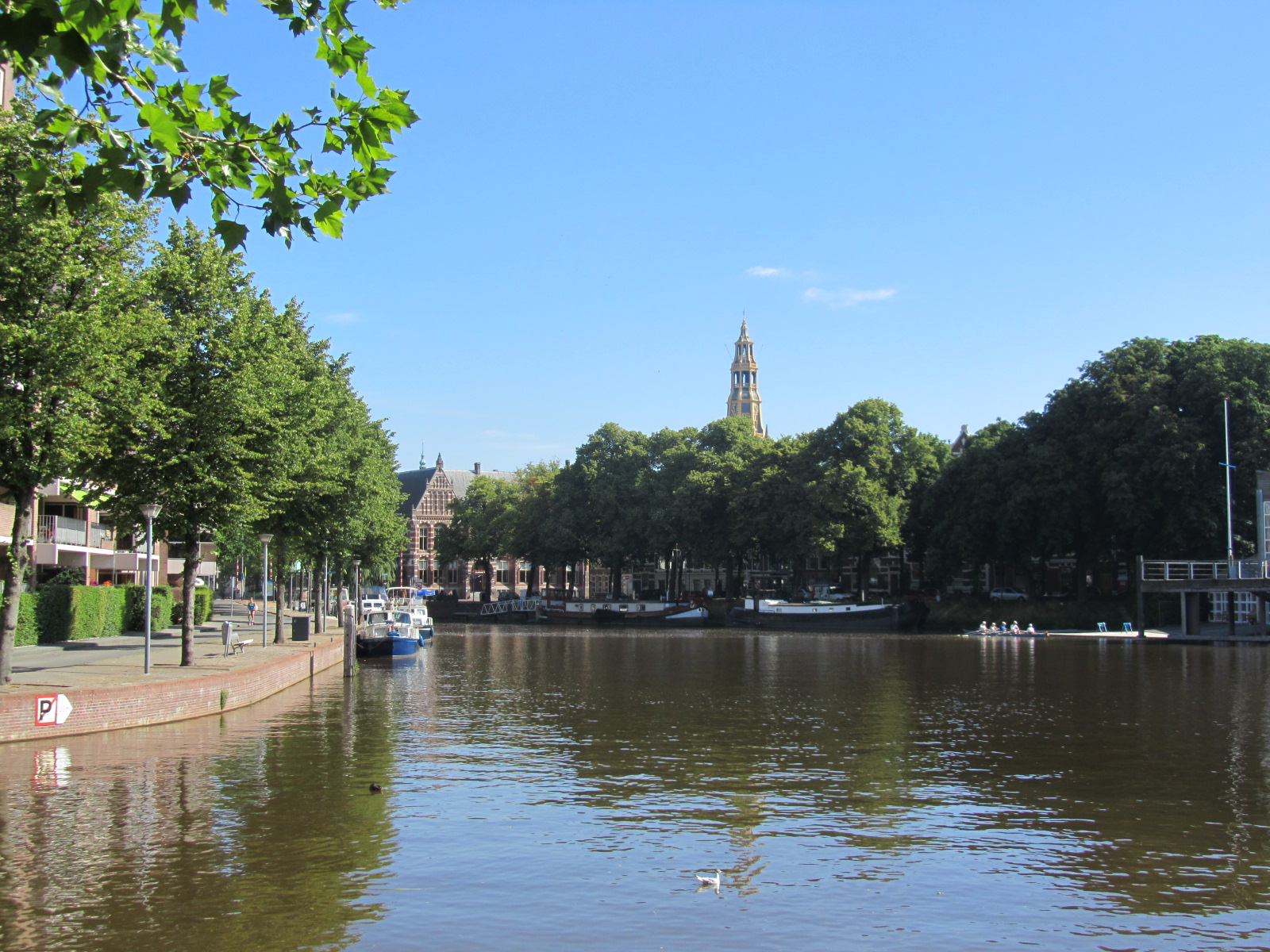 knooppunten netwerk kun je steeds een andere route samenstellen, waardoor je zo’n stad ook van allerlei kanten in- en uit fietst, zonder probleem, maar daardoor ook op mooie plekken komt, die buiten een ‘normaal’ stadsbezoek vallen, waarbij je alleen komt op plekken die staan aangegeven als highlights. Dit is het Reitdiep met de A-kerk op de achtergrond.