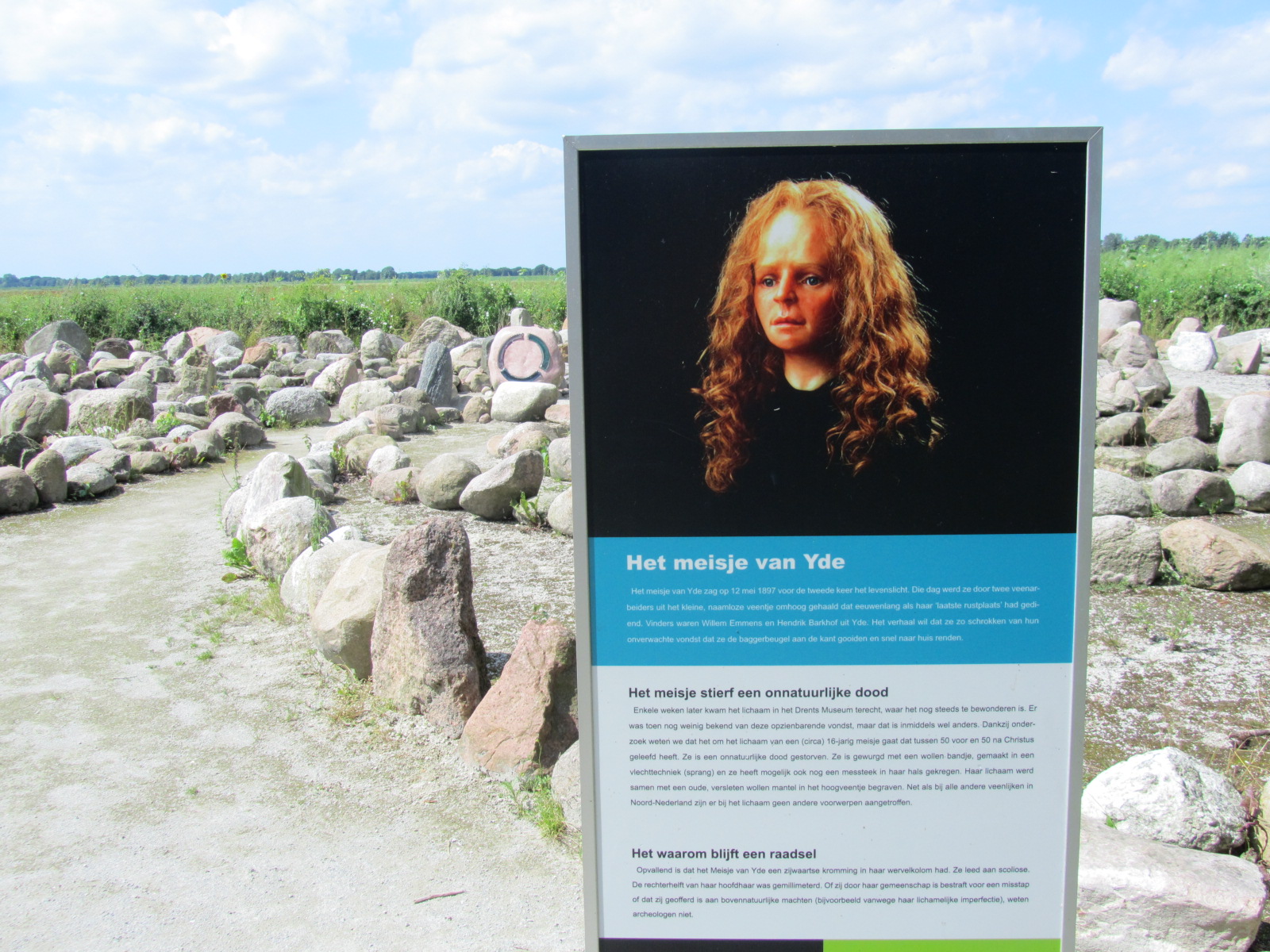 In zuidelijke richting maak je prachtige tochten in het dal van de Drentse A. Gasteren en Rolde waren wel de zuidelijkste punten. Onderweg kom je herhaaldelijk hunebedden tegen zoals deze bij Anlo. Ook kwamen we langs de vind plek van ‘het meisje van Yde’. Er is een soort monument van gemaakt, maar het maakt toch wel indruk om te beseffen, dat er zolang geleden ook al mensen leefden in dit gebied.