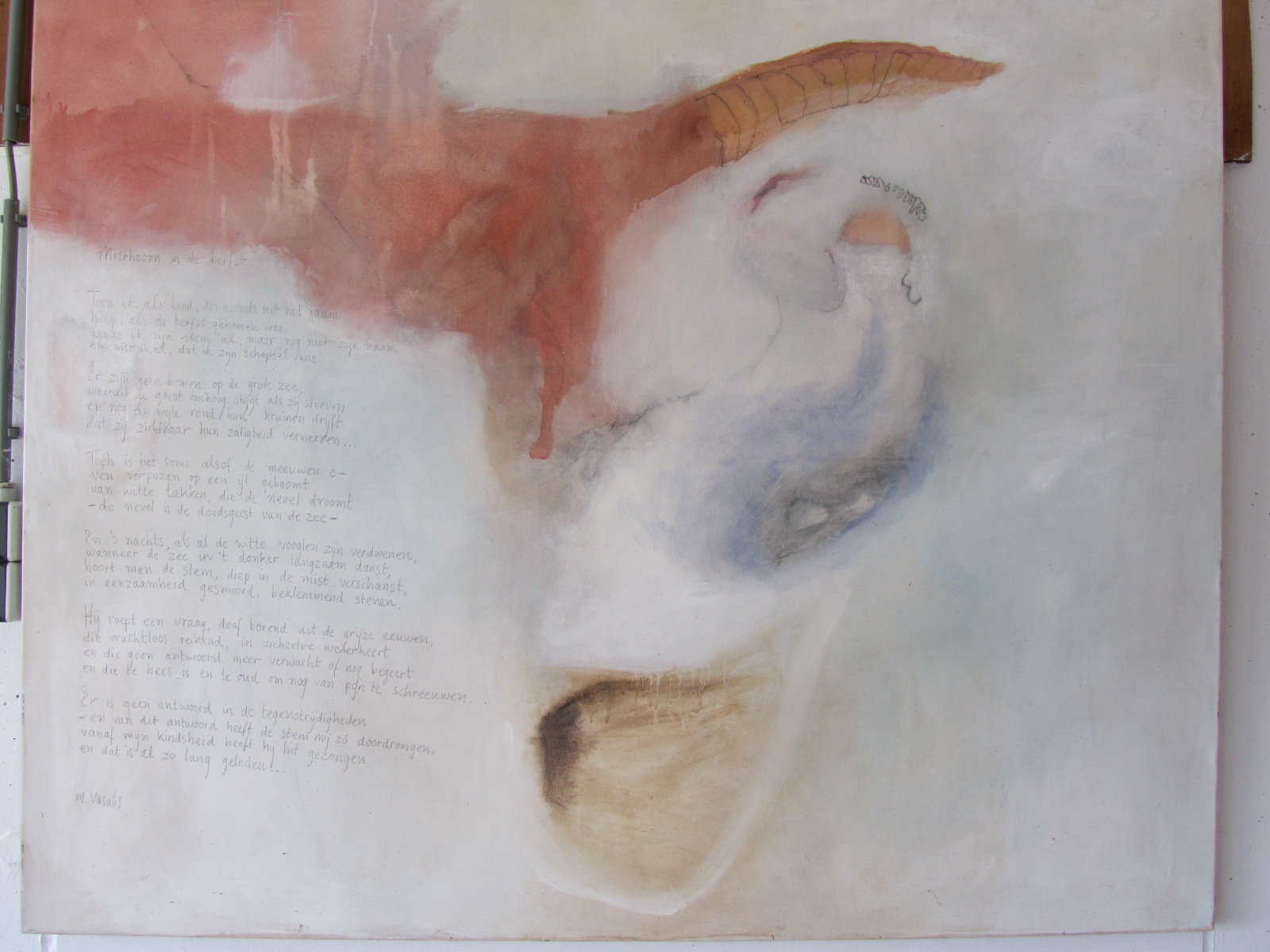Een indrukwekkend schilderij vond ik dit, geïnspireerd op een schedeltje van een schaap en een gedicht van Vasalis, dat er ook met potlood op geschreven staat.