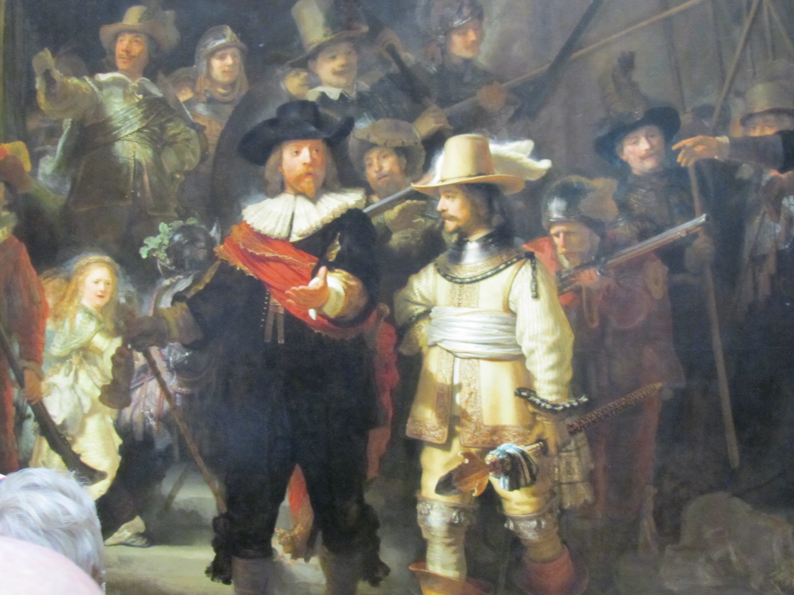 Er zitten heel wat verhalen vast aan allerlei details van de Nachtwacht. Ik was dit keer erg geïnteresseerd in de hand van Frans en de schaduw ervan. Inmiddels heb ik al drie theorieën gehoord, waarom Rembrandt dat zo geschilderd zou hebben: