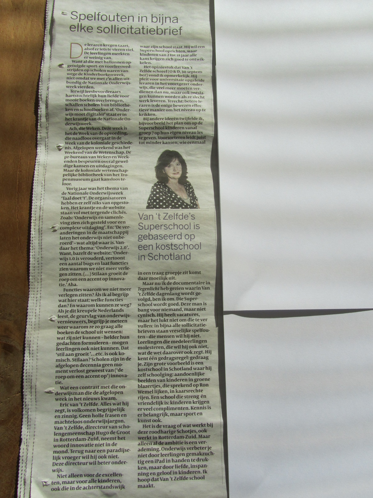 Ik heb de documentaire in Tegenlicht gezien waarin Erik van ’t Zelfde, directeur van Scholengemeenschap Hugo de Groot in Rotterdam-Zuid, gepassioneerd vertelt over zijn ideale onderwijsvorm. Hij wordt gevolgd in zijn werk en ik was erg onder de indruk van zijn doortastende optreden en bevlogenheid over onderwijs, zijn geloof in de kinderen, met maar één doel: de kinderen vooruit te helpen. Hij gaat voor een veilige school met alleen maar de beste leraren. Dat zijn leraren met hart voor de zaak, die universitair geschoold zijn en de capaciteiten hebben om de kinderen te bieden wat ze nodig hebben, niet alleen slaafs de methode volgend. Ik doe de beste man tekort in dit stukje, maar Aleid Truijens schreef in de Volkskrant vandaag weer een onderwijsstuk naar mijn hart en ze neemt het óók op voor Erik Van ’t Zelfde. Ik hoop dat Erik zijn ideaal van Superschool kan verwezenlijken en daarmee een inspiratie gaat zijn voor het hele onderwijsveld.