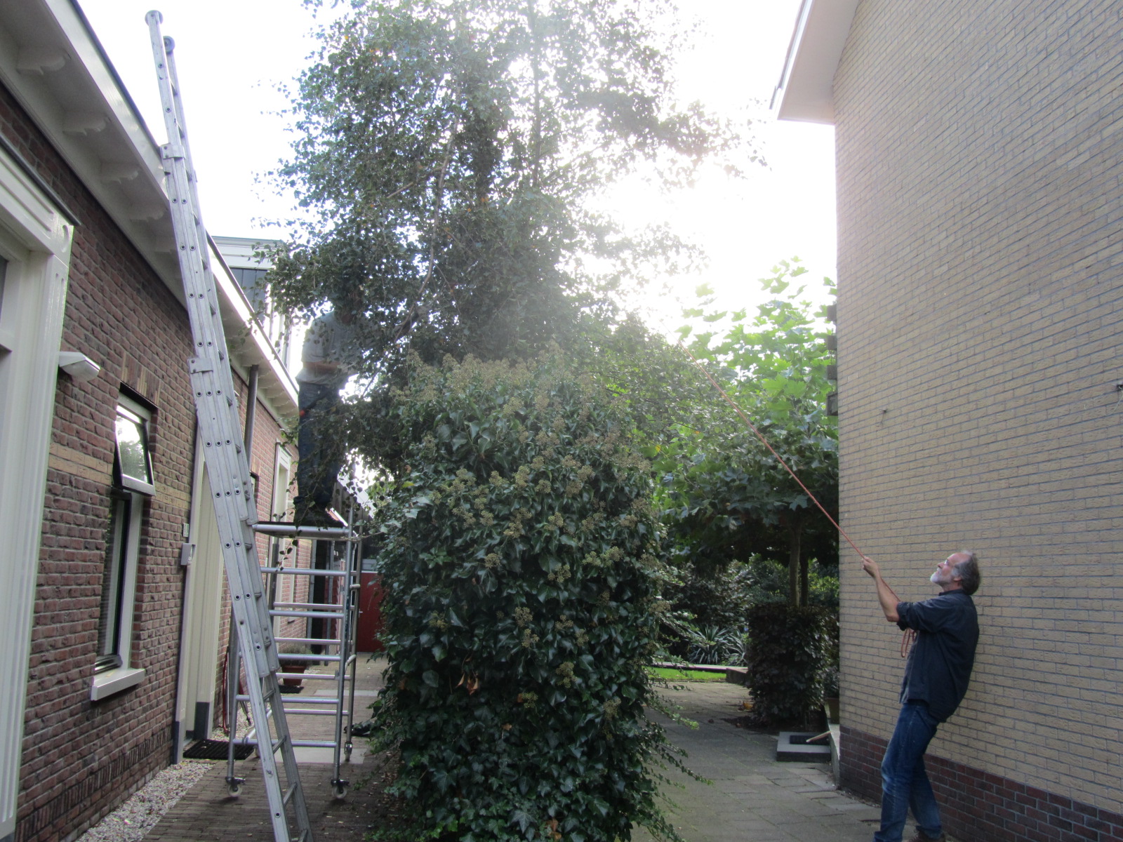 Hoe meer wind, hoe meer er berkenboomzaad of vruchtjes van de boom naar binnen dwarrelen. Als de ramen op een kier staan, als je de voordeur open doet, meteen ligt alles ermee vol. Je blijft op deze manier schoonmaken en je hebt het idee dat het dweilen is met de kraan open. Dus is de berk een kopje kleiner gemaakt door buurman en manlief. Dat scheelt een heleboel schoonmaken! (thema Stuureenfoto)