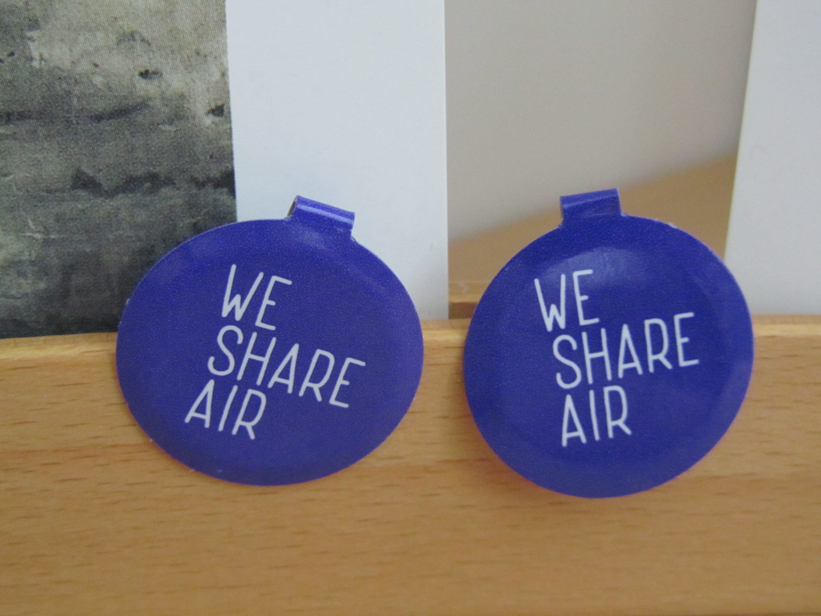 Het metalen clipje, dat elke bezoeker van het museum krijgt, als entreebewijs, is dit keer niet voorzien van het gebruikelijke museumlogo, maar het is een kunstwerkje met de tekst: ‘we share are’. Als drager van het clipje deelt de bezoeker lucht en ruimte met de wereld van Navid Nuur, is het idee van de kunstenaar
