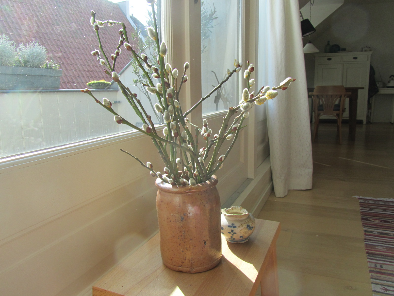 De zon, die heerlijk de huiskamer binnen schijnt op een vaas met ‘katjes’. De katjes zijn geplukt van een omgewaaide wilg, tijdens een wandeling in Limburg de afgelopen week. Als ik katjes zie, vind ik dat altijd een teken, dat het voorjaar eraan komt. Ik word er blij van. Dus de vaas, samen met de weldadige zonnestralen zijn voor mij voorboden van de lente.