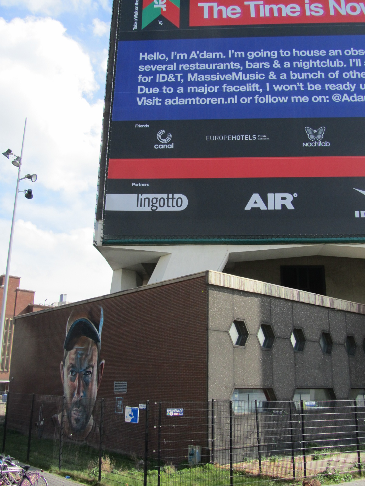 Fietsend naar het IJ zag ik op de zijkant van het hoge Shellgebouw dit portret staan. Heel indrukwekkend en apart ook dat die giga toren nog boven op zijn hoofd zit. Die kreeg ik niet goed op de foto. Dit portret hoort wel bij het thema ‘Buitenkunst‘ bij Stuureenfoto van deze week.