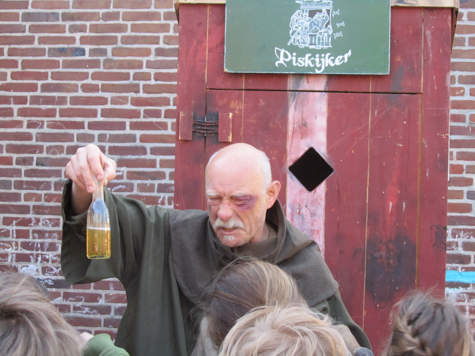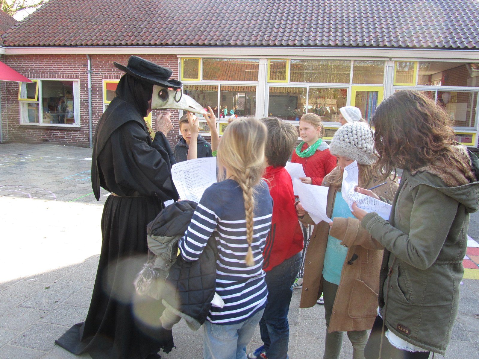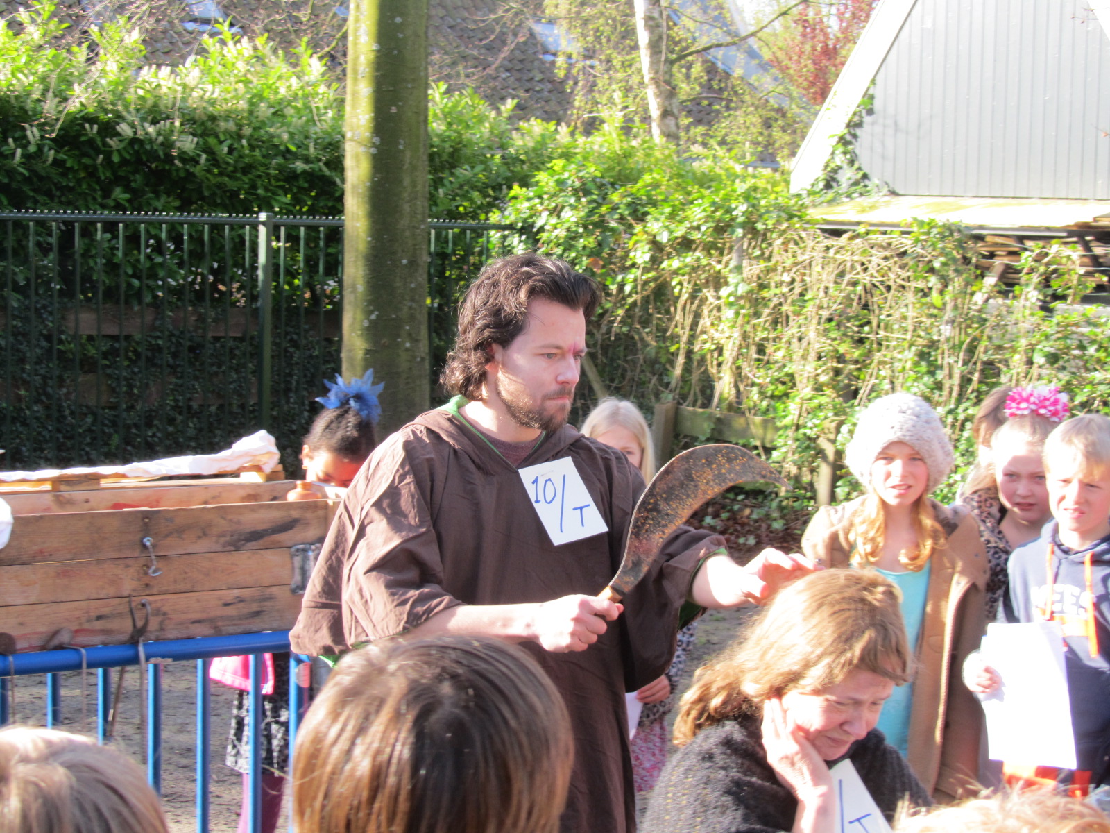 Aanschouwelijk onderwijs noemen we dat. Er kwamen mensen van het Middeleeuws Genootschap Monnickendam bij ons op school. Ze liepen rond als heuse Middeleeuwers over het plein en de kinderen konden alles vragen aan hen wat ze weten wilden. De mensen beeldden beroepen uit zoals chirurgijn, rattenvanger, pestdokter, barbier, schout piskijker enzovoort. De kinderen hebben veel geleerd en genoten van alle acts die tussendoor ook nog gespeeld werden. De Middeleeuwen kwamen tot leven.