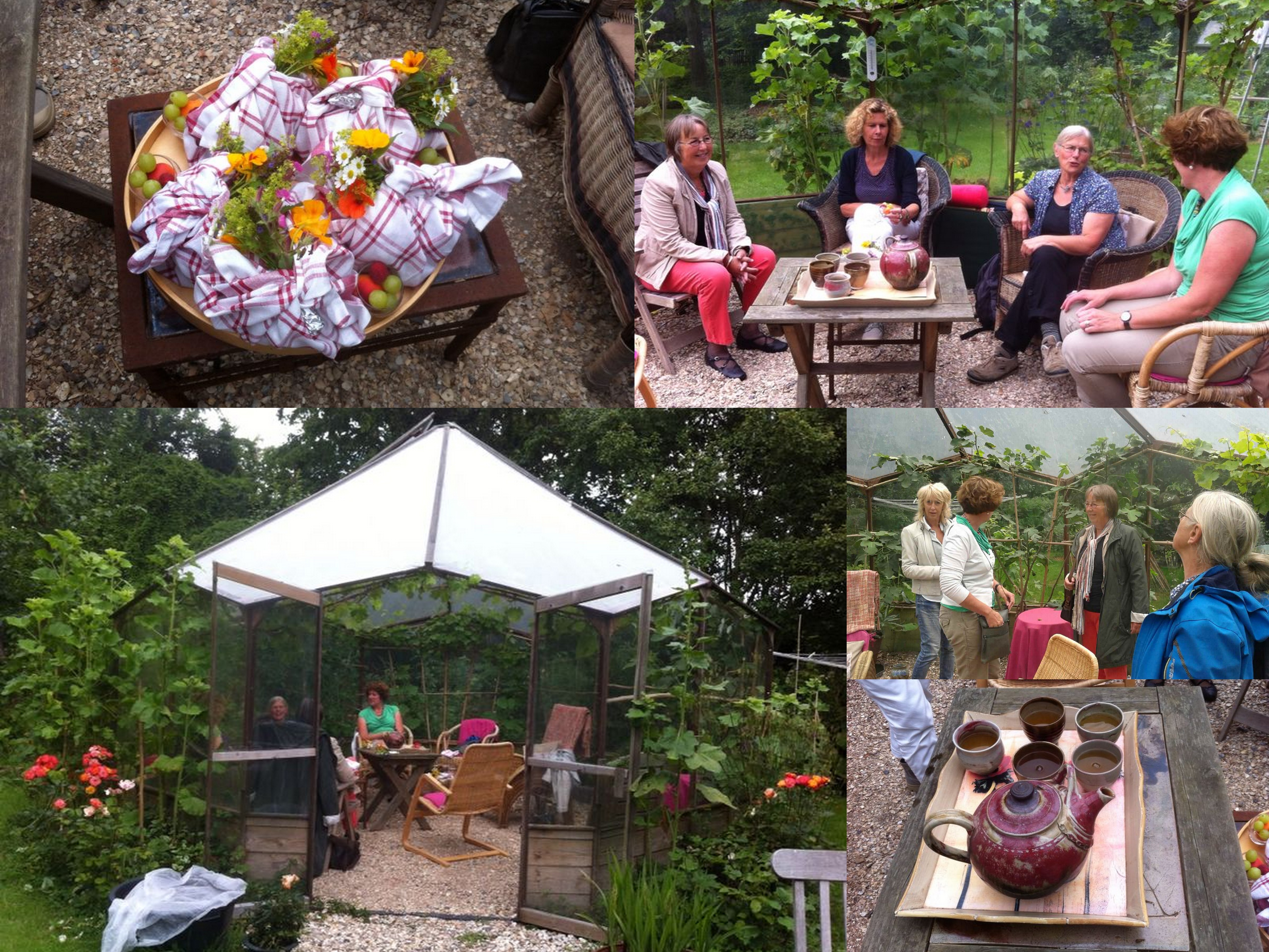 Vandaag op stap met vier vriendinnen/ oud collega’s. Eerst koffiedrinken in een mooie, sfeervolle achtertuin in Edam. In de natuurtheetuin in de Zuidoostbeemster kregen we een lunch aangeboden in een theedoek, opgefleurd met fruit en bloemetjes uit de eigen schitterende tuin. We zaten in een ronde kas, heel lekker warm en gezellig. Wat een prachttuin om even uit te rusten op een fiets- of wandeltocht!