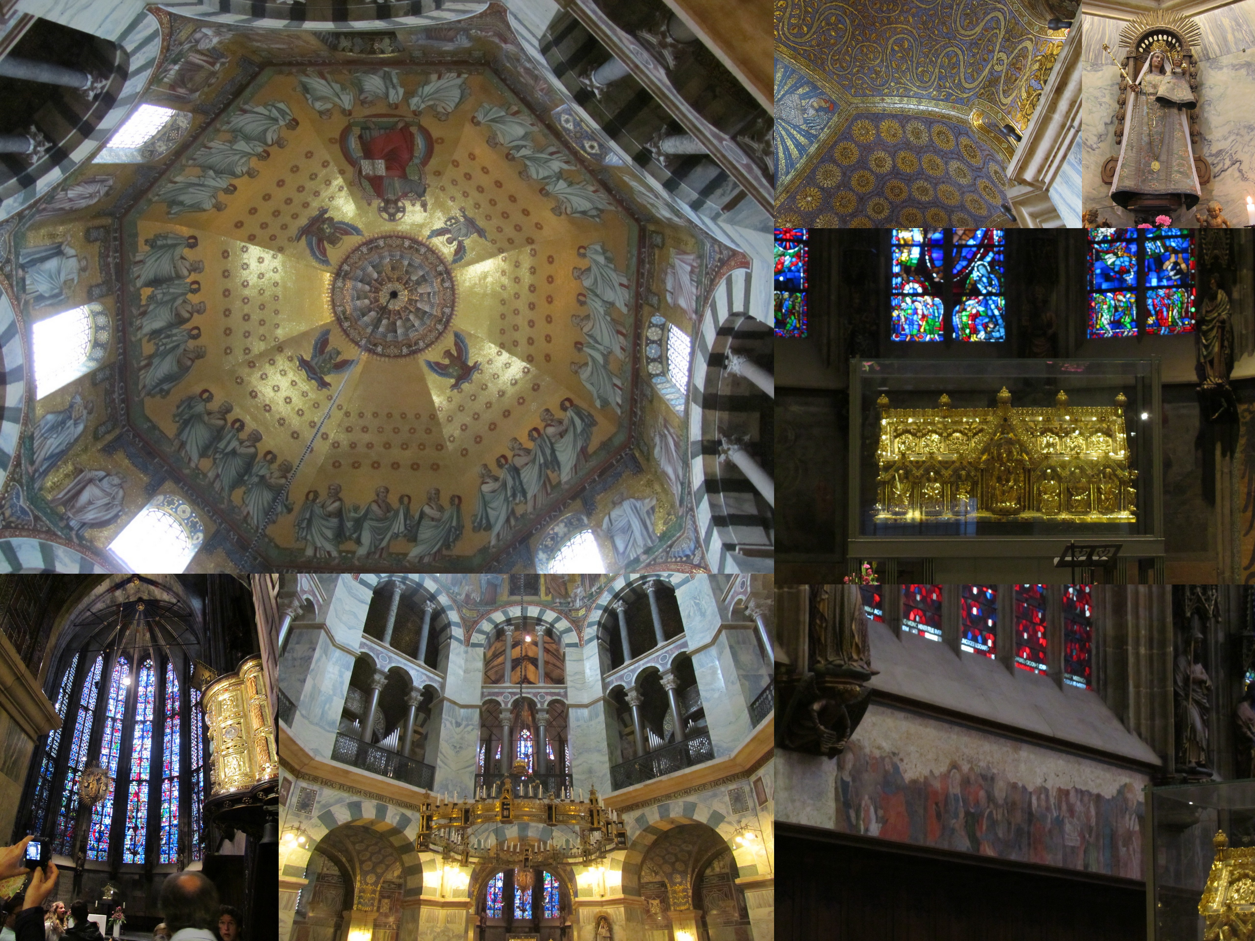 Als je in Aken bent moet je toch ook de Dom bezocht hebben. Het is de kerk van Karel de Grote, zijn kroningsplek, maar ook de plek van de schrijn met zijn overblijfselen. Het is een bedevaartsoord, dit jaar vindt er weer de 7 jaarlijkse Heiligdomsvaart plaats. Kortom een interessante geschiedkundige plek. Nog niet zo lang geleden heeft er een restauratie plaatsgevonden. De oude kerk heeft veel spotlights gekregen, waardoor het goud dat verwerkt is in de preekstoel, de plafonds van mozaïeken, de schrijnen je tegemoet schitterde.