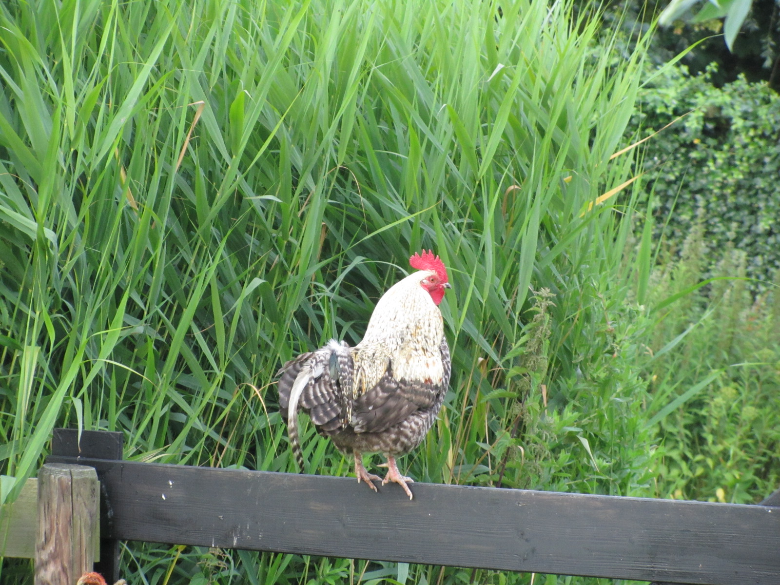 Vanochtend waren het een haan en een hermelijntje, die ik tegenkwam. De haan was waarschijnlijk net klaar met zijn gekraai dus die kon ik rustig op de foto zetten, maar het hermelijntje (of misschien was het een wezel) was alweer verdwenen voordat ik mijn camera in stelling gebracht had. Jammer.