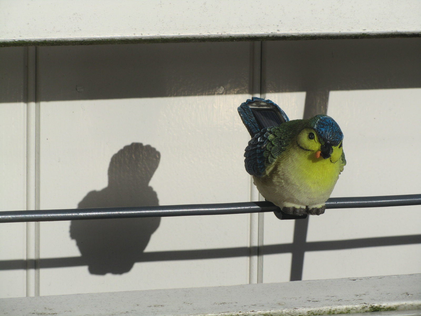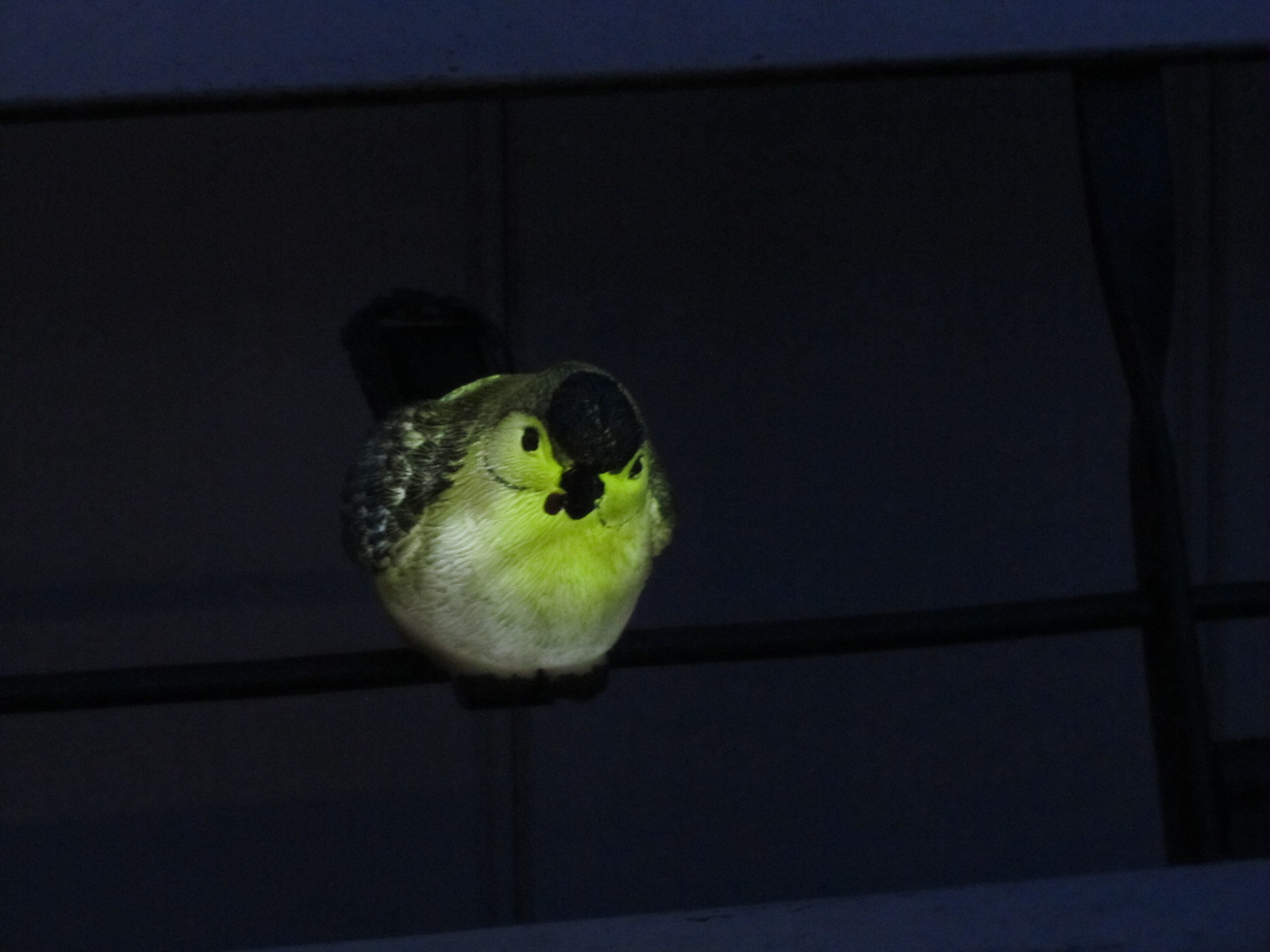 IMG_6367In de wintermaanden deed hij het niet, maar sinds een paar dagen is er blijkbaar weer genoeg zon, waardoor ons koolmeesje in het donker licht geeft. Het vogeltje is voorzien van een solarlampje. Door zonlicht op te vangen, gaat hij in het donker schijnen. Zo grappig en bovendien merk je zo dat de dagen lengen en ’t voorjaar eraan komt. De vogel lijkt wel als lokmees te fungeren, want ik zie opeens ook echte koolmeesjes op ons balkon.