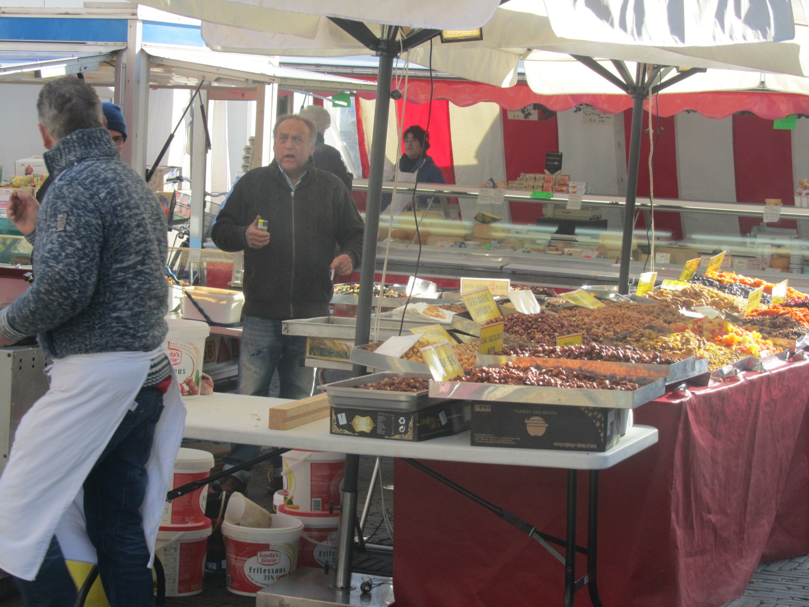 Gisteren gingen we een dag naar Heerlen, waar een vriendin woont. In Heerlen ben ik 6 jaar naar de middelbare school gegaan. Op het marktplein vóór het glaspaleis van Schunck kreeg ik dan ook een flashback met de zestigerjaren. Ook toen waren er al markten, alleen stond in mijn herinnering het plein toen altijd helemaal vol met kramen. Ik vind markten leuk om over te lopen en de koopmannen druk bezig te zien om hun waren aan de man/vrouw te brengen, vaak op een humoristische manier. De foto is er dus meer een van de sfeer op de markt dan van de aangeboden eetwaar.