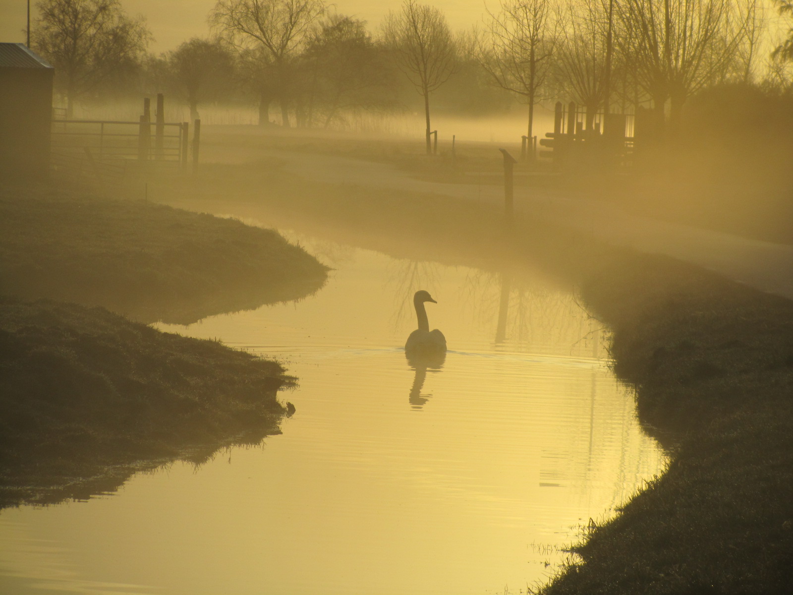 IMG_6511Een prachtig begin van mijn fietsseizoen. Ik weet weer wat ik de hele winter gemist heb. Een prachtige zonsopkomst met mist over het land en volkomen windstil. Heerlijk vooruitzicht om elke dag te mogen fietsen door dit land. De zwaan liet zich mooi vastleggen tegen de zon in.