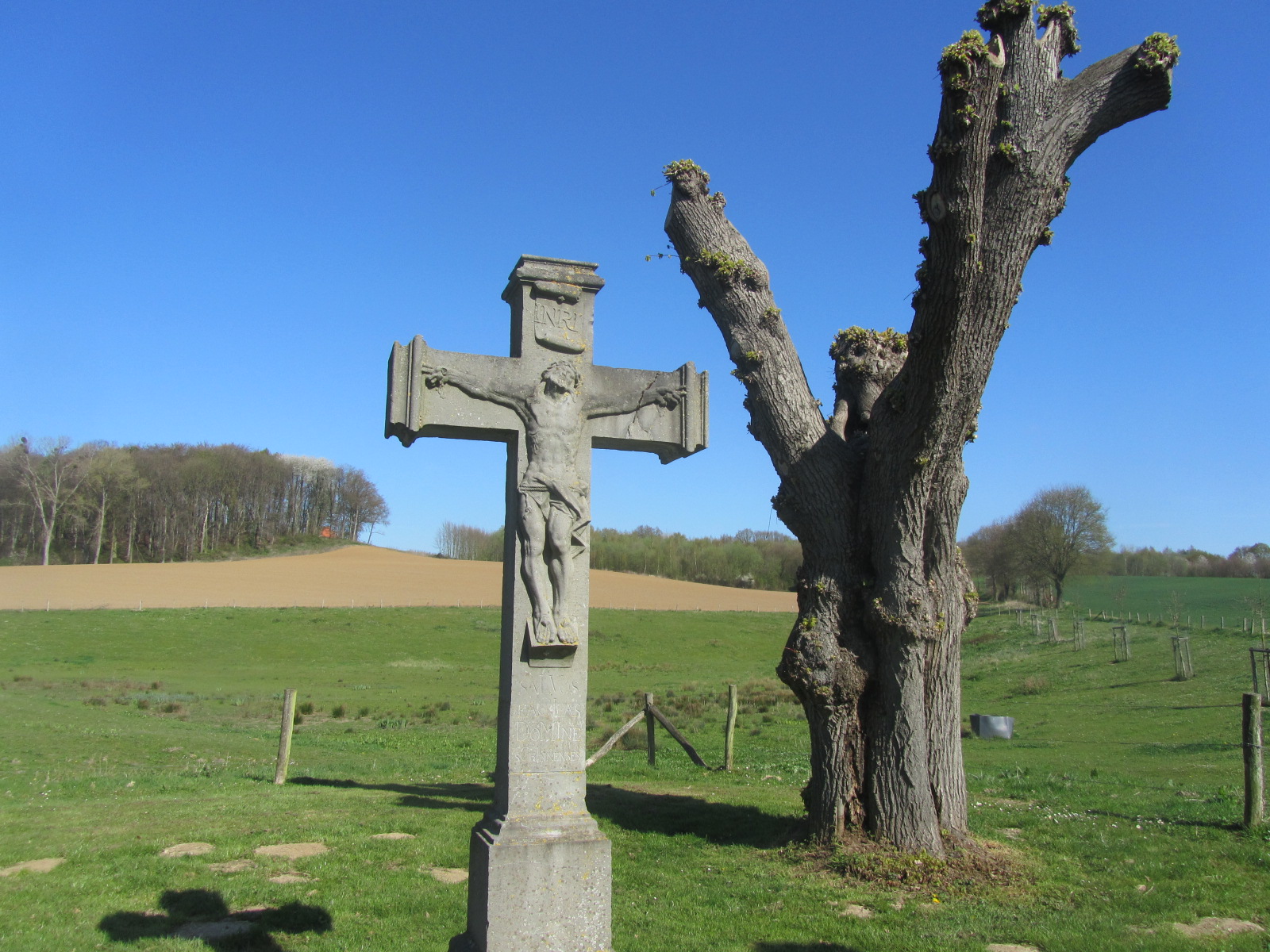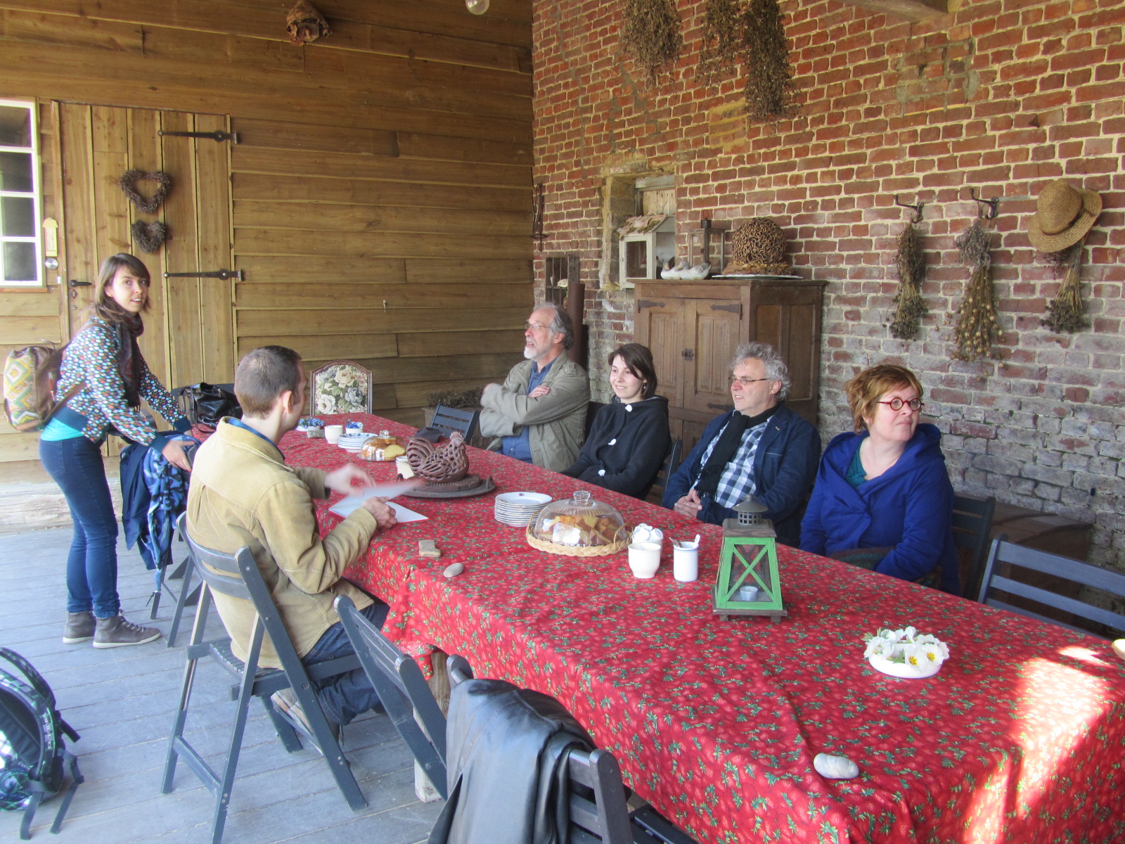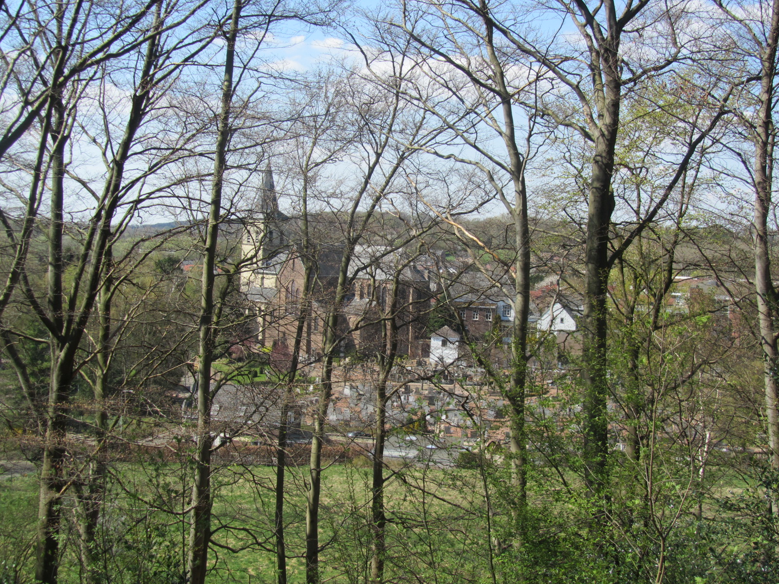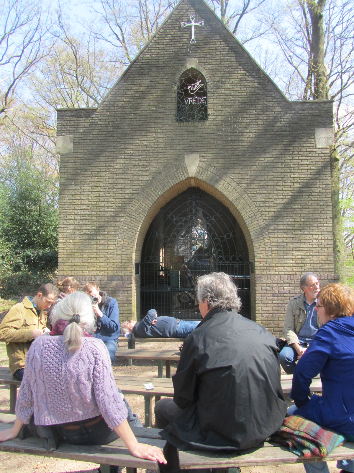 We hielden een knapzaklunch bij de Mariakapel, een hoog punt in het bos. Daarvandaan liepen we via het kerkhof waar onze ouders begraven liggen naar een echte Limburgse boerenhoeve.