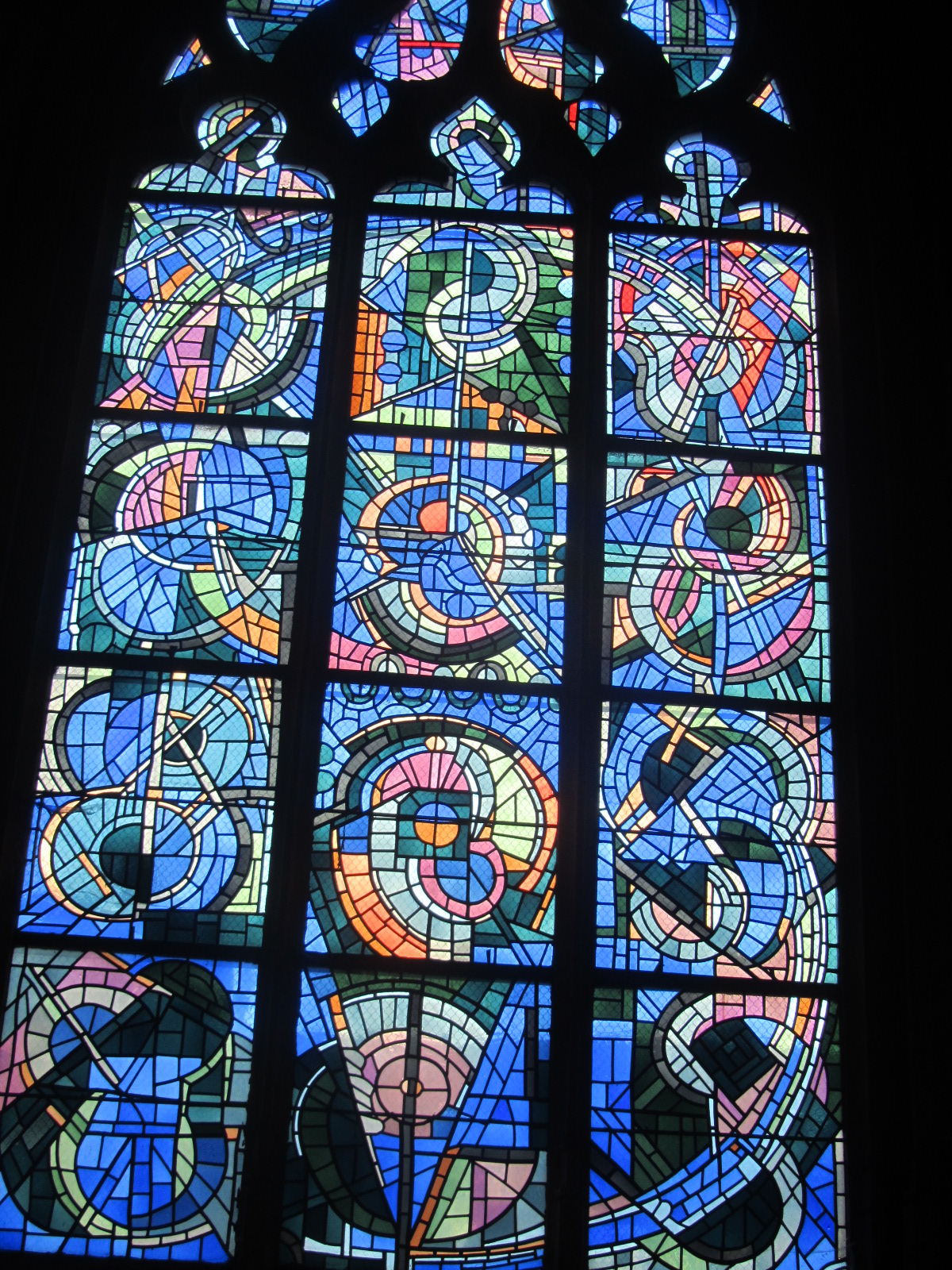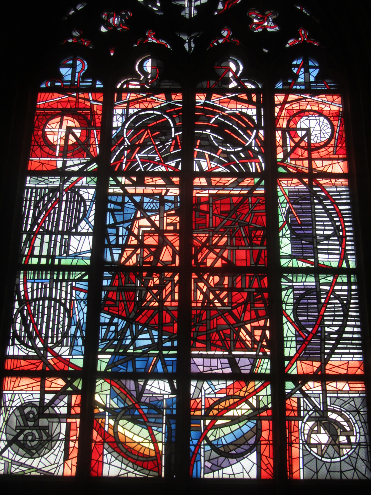 IMG_7076  Tijdens een stadswandeling door Charleville-Mézières in de Franse Ardennen liepen we de Basiliek Notre Dame d’Esperance binnen. Het is een eeuwenoude basiliek opgedragen aan de Zwarte Madonna. Wij werden erg verrast door de moderne glas-in-loodramen in die oude kerk. De geschiedenis vertelt dat de basiliek verwoest werd tijdens de eerste wereldoorlog. Daarmee gingen toen de oude glas-in-loodramen verloren, die Victor Hugo nog eens beschreven heeft in één van zijn boeken. De basiliek is hersteld en René Dürrbach heeft er zijn levenswerk van gemaakt om de kerk te voorzien van nieuwe ramen. Wij vonden het indrukwekkend goed geslaagd. Heel abstract, maar je kon er toch heel goed uithalen wat er werd bedoeld, door de kleurstellingen en belijningen. Er was een schriftelijke rondleiding in de kerk te vinden. Heel uitgebreid bekeken wij alle ramen met titels als: God schept de wereld, Onbevlekte Ontvangenis, Pinksteren, Hemelvaart enz.