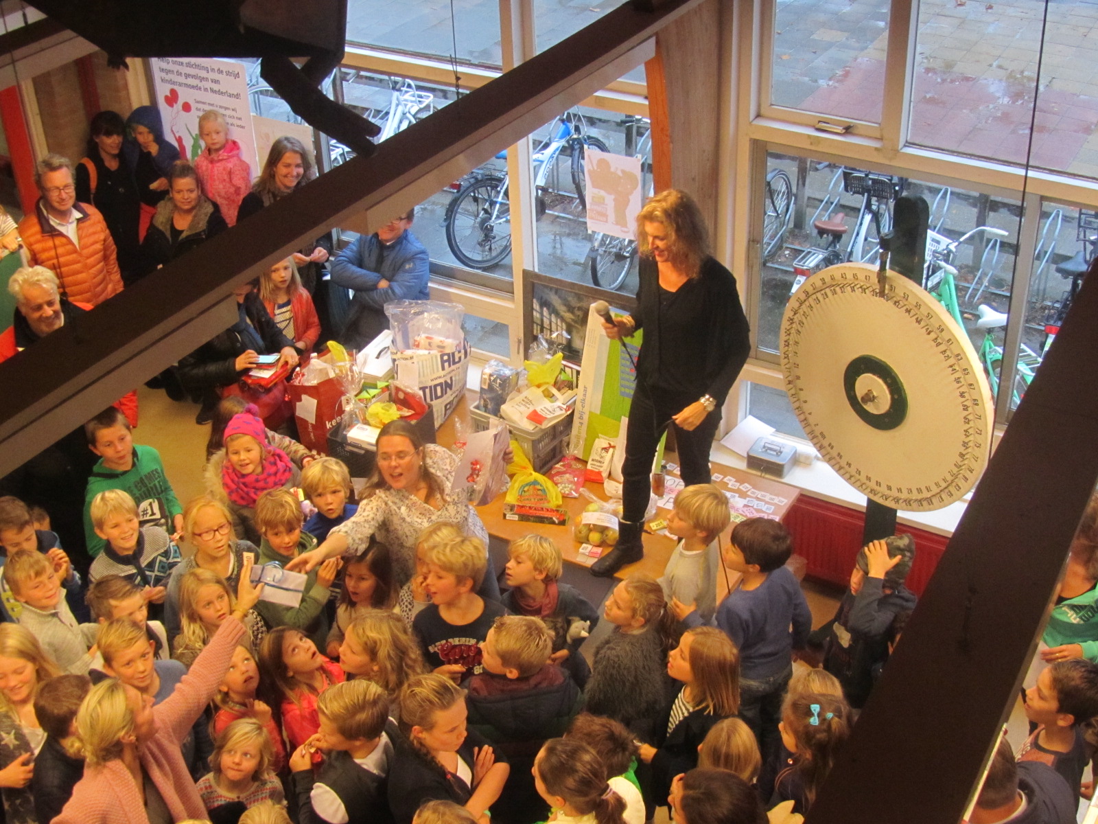 Gistermiddag, vlak voor de herfstvakantie werd op onze school een rommelmarkt gehouden. Het kwam niet zo maar uit de lucht vallen, maar het was de afsluiting van een project over ‘Kinderen helpen kinderen’. Onze leerlingen zijn de afgelopen weken actief bezig geweest met allerlei acties voor het goede doel. Het onderwerp was heel actueel, dus het leefde sterk. Dat zag je ook gisteren aan de gigantische drukte in school. Met name de loterij met het rad van fortuin was een doorslaand succes. Er waren dan ook mooie prijzen te winnen, allemaal aangedragen door mensen uit het dorp. Ik keek op van het prijzenaanbod bijvoorbeeld 4 yogalessen, een lezing over enneagram bijwonen, tandenbleken, een weekend lang rijden in een Tesla enzovoort. Ik ben benieuwd wat dit alles heeft opgebracht.