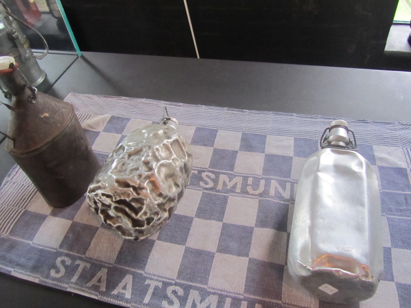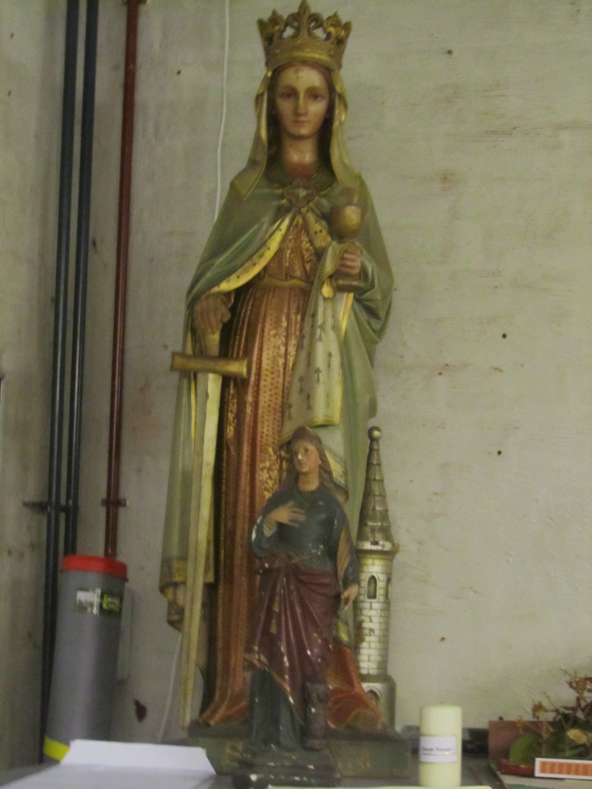 Het voormalig schachtgebouw en twee beelden van de H. Barbara, beschermheilige van de mijnwerkers. Verder drinkgerei, een poekel, waar de lunch in ging en cokes.