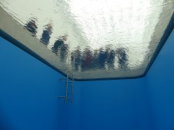Het zwembad, waar je van bovenaf de mensen onder water ziet en je ook van onderwater tegen de bovenrand aan kunt kijken.