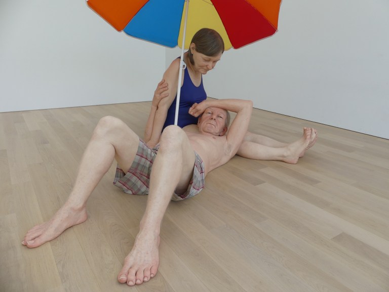 Maar het pronkstuk is toch wel het reuzen echtpaar, dat ligt te zonnen. Ik had er al zoveel foto’s van gezien, dus ik veronderstelde dat ik dit werk al kende. Maar ik vond het zo indrukwekkend, realistisch gemaakt. Ik voelde me een gluurder, die de mensen hun privacy ontnam. Ik raakte niet uitgekeken en moest dan ook gewoon van dichtbij kijken naar die huid met ouderdomsvlekken, die haartjes uit de neus en waar wij mensen zoal haargroei hebben. Het was onbeschrijfelijk natuurlijk allemaal, ook de houdingen van de lichamen, handen en voeten. Maar dat alles dan in reuzenformaat. Ik zag, dat ook de oude mens mooi is om te zien.