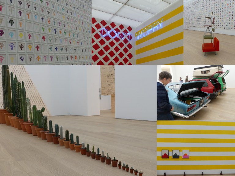Een heel andere sfeer straalde het werk van Martin Creed uit. Veel felle kleuren, muziek en ordening zijn de rode draden door zijn werk. Martin vindt dat alles wat de mens in het dagelijks leven gebruikt kunst kan zijn. Hij wrikt de vormen los van de context en brengt er een ordening in aan. Dit is kort gezegd. Wij werden erg vrolijk van dit werk. Alles is kunst, je moet het maar bedenken!