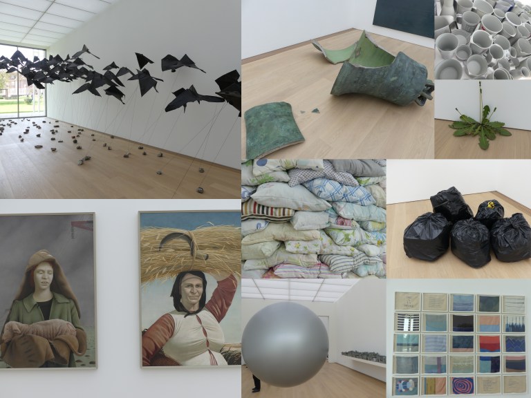 Het tentoongestelde werk in museum Voorlinden zou je in drie gedeeltes kunnen hakken. Alle werken die hoorden bij de tentoonstelling ‘de tussentijd’ hadden te maken met tijd en tijdsbeleving in de ruimste zin. Het was heel divers en door de toelichtende informatie kon je steeds goed mee in de gedachtegang van de kunstenaars. De collage geeft een indruk van wat er te zien was. Het voert te ver om alles toe te lichten. Maar de paardenbloem wil ik er even uit lichten. Die staat te groeien uit de muur van de museumzaal. De kunstenaar wilde doodgewoon onkruid vereeuwigen, dat altijd onder de voet wordt gelopen. Nu die paardenbloem in brons gegoten (niets van te zien) staat, kun je zo’n plant weer als nieuw ervaren. Zelf gaan kijken is het beste.