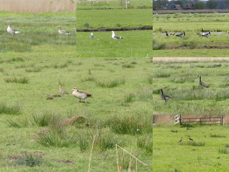 Op het land allerlei drukte van grauwe ganzen, brandganzen, nijlgans, Canadese gans, meeuwen, futen en nog meer.