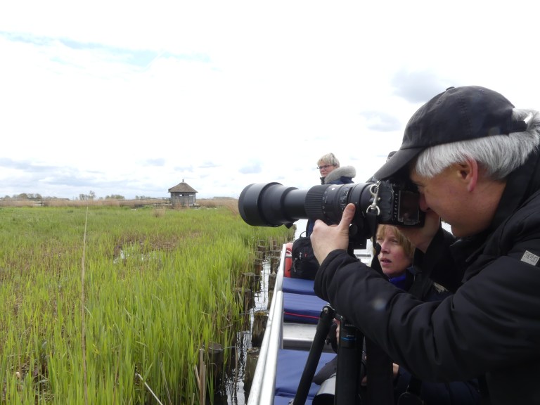 Ondertussen wees de gids ons op allerlei vogels aan de kant. Er werd gefotografeerd dat het een lust was. Maar met een varende boot en vogels die niet echt stil gaan zitten om te poseren, was het nog lastig om goede, scherpe foto’s te maken. Op het land was er een en al bedrijvigheid. Jonge pulletjes, moeders die krijsend en met oorlogstooi hun jong beschermen (kievit) , een fuut zat te broeden en we lieten een paar ganzen opvliegen van hun nest.