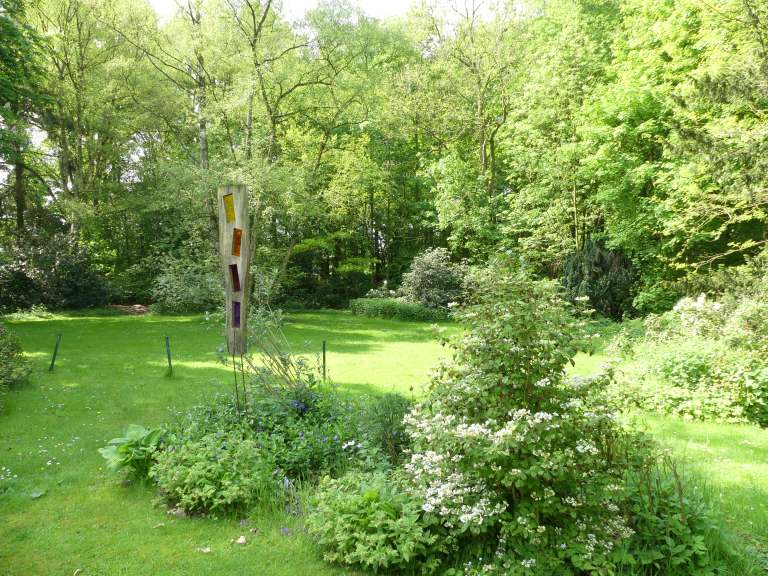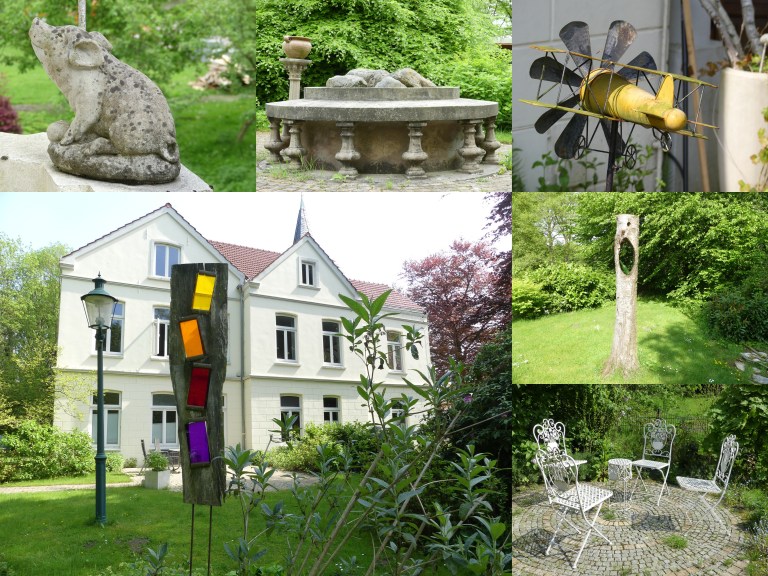 Op de eerste ochtend in Nieder Sachsen werden we begroet met een stralende zon en heerlijke temperatuur. Uitgelezen moment om de tuin te verkennen. Vanaf het gazon loop je zo het bos in.De magnolia is helaas uitgebloeid, maar de ruige vormen steken mooi af tegen het gebouw.De ornamenten, die her en der staan opgesteld heb ik bij elkaar gebracht in een collage.En verder deed ik een rondje planten. De hele ochtend heerlijk genoten, maar het werd erg warm, dus pakten we de fiets en maakten een rondje, waarvan we vanavond om 20.00 uur pas terug waren. Morgen meer hierover.