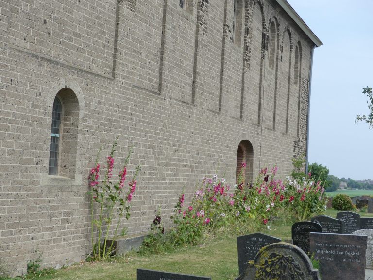 De kerk van Oosterland had een prachtige rand van stokrozen. Het staat zo mooi tegen die lichte stenen muur.