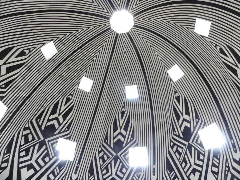 De markante koepel van het Bonnefantenmuseum in Maastricht wordt Cupola genoemd. Het werk dat daar momenteel in te zien is, doet die naam eer aan. Stenley Donwood heeft er een zwart-witte muurschildering in gemaakt, helemaal tot de nok toe. Hij wil je het  gevoel mee geven wat je ook wel kunt hebben in een kathedraal. Daar blijf je ook omhoog kijken naar soms duizelingwekkende hoogtes. In ligkussens met psychedelische muziek erbij, kon je helemaal in hoger sferen komen. Voor de liefhebbers dan hè.