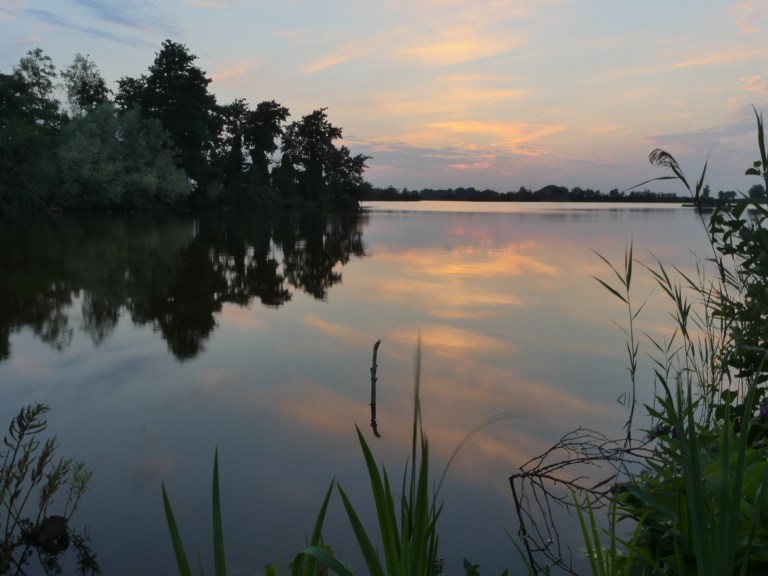 Op ons logeeradres waren we omringd door water. Eigenlijk liep er een dijk dwars door een groot meer. Aan die dijk lagen wat huizen, met stuk voor stuk schitterende tuinen aan het water. Het was een warme en daardoor vermoeiende wandeldag, maar met als kroon op alle inspanning konden we genieten van een prachtige ondergaande zon boven de plas.