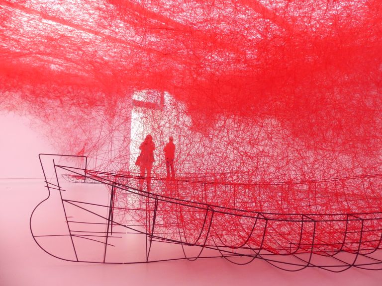 Chiharu Shiota maakte de installatie ‘Uncertain Journey’. Van te voren had ik er al foto’s gezien, maar ik was toch onder de indruk toen ik daar, in het Noordbrabantsmuseum in Den Bosch, in de zaal stond, die helemaal volhing met in elkaar geweefde draden, als een soort rood spinnenweb. In een film had ik de kunstenares horen uitleggen, dat ze met die draden, van 2000 bollen rode wol, wilde aangeven, hoe elk mensenleven verweven is met andere levens. De bootjes geven stabiliteit aan van de levensreis. Ik vond het erg mooi om eronderdoor te lopen en vanuit allerlei hoeken weer andere effecten te zien, die door het samenkomen van de draden onstaan waren. Een heel fotogeniek schouwspel. Ik kon mijn hart ophalen. Chiharu heeft ook ander werk gemaakt, dat ook te zien is in deze overzichtstentoonstelling. Ik beperk me hier tot de draden. Indrukwekkend!