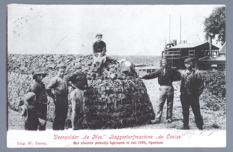 Ik ontdek op de site van Geschiedenislokaal Waterland een foto van een baggerturfmachine, die in de Nespolder werd gebruikt met de naam LOUISA. Ik denk nu, dat de wielen ook onderdelen zijn geweest van die machine. Dat weet ik niet zeker, want op onderstaande foto kun je de machine niet zien, hoewel de titel dat aangeeft.