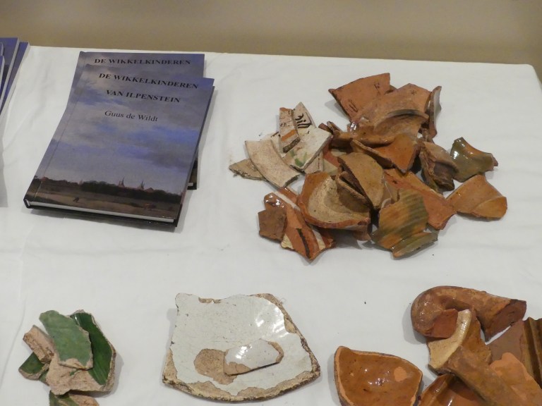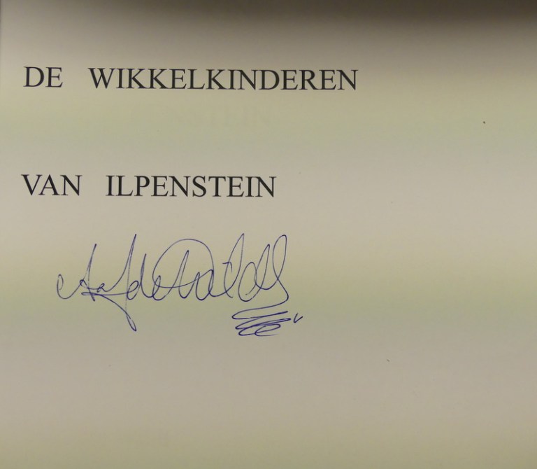 De oudheidkundige vereniging van ons dorp had ter opluistering van de jaarvergadering Guus de Wildt uitgenodigd. Hij is de schrijver van het boek ‘De wikkelkinderen van Ilpenstein’. Die wikkelkinderen hebben mij al een tijdje in hun greep. Lees mijn blog maar hier, hier en hier. Ik liet mij deze gelegenheid natuurlijk niet ontzeggen en ik was getuige van een inspirerende lezing over het boek en wat achtergronden over het ontstaan ervan. De schrijver woonde als kind vlakbij het voormalige landgoed. Hij vond daar veel scherven, wat hem op het idee bracht om later archeoloog te worden. Dat heeft anders uitgepakt, hij werd leraar. Toch bleven die scherven hem intrigeren en zoals hij het formuleerde is hij begonnen om in figuurlijke zin de scherven te lijmen. Scherven kunnen een verhaal vertellen. Die zoektocht naar verhalen heeft hij vele jaren later voortgezet, niet als archeoloog op zoek naar nog meer scherven, maar via internet. Het boek van de Wikkelkinderen is hieruit voortgekomen. Het is een mix van historische feiten en de fantasie van de schrijver. Na afloop trok ik de stoute schoenen aan en vroeg om een handtekening van Guus de Wildt. Nog nooit eerder vroeg ik iemand om een handtekening,  maar bij deze gelegenheid moest ik het gewoon doen. Het maakte het voor mij compleet.