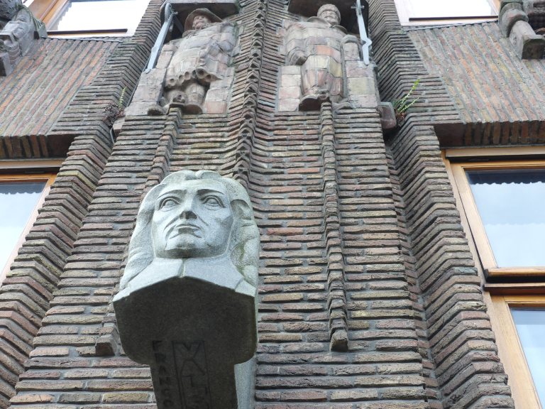 Dit is een stuk van de gevel van het Amrath hotel aan de Prins Hendrikkade in Amsterdam. Vroeger was het Scheepvaardijhuis. 6 Rederijen hebben samen dit gebouw in begin 20ste eeuw laten neerzetten, zodat ze een gezamenlijk hoofdkantoor hadden. Je kunt wel zien dat daar het geld zat! Het hele gebouw is opgetrokken in Art Nouveau stijl, oftewel in de stijl van de Amsterdamse school. Ik ben wel blij met die rijke stinkers. Zij zorgen er toch maar voor, dat wij kunnen genieten van architectonische hoogstandjes. En alleen kijken is voor mij genoeg, maar als je wil, kun je er ook overnachten, tegenwoordig.