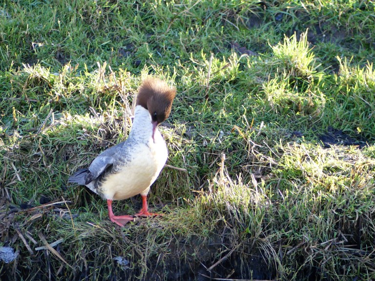 We troffen ook nog een vrouwtje van de Grote Zaagbek aan de kant van het water, toch wel een aparte verschijning hier. Het is een wintergast  op doortocht naar Scandinavië of Rusland om daar in maart te gaan broeden.