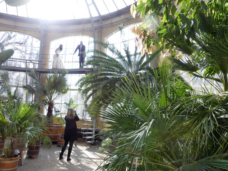 De oranjerie biedt ’s winters onderdak aan allerlei kuipplanten. Het blijft een prachtige plek, dat vond ook dit bruidspaar, dat zocht naar een fotogenieke achtergrond.