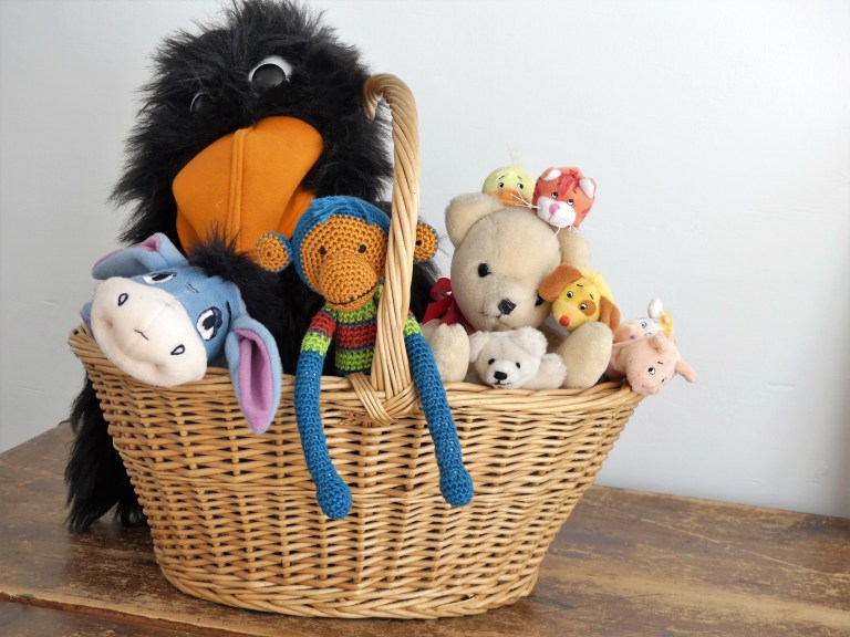 Eigenlijk zijn ze niet meer nodig hier in huis. De kinderen zijn de deur uit en kleinkinderen hebben we niet. Dus niemand zal er nog mee spelen. Toch heb ik een restant aan knuffels bewaard en opgeborgen in een mand. Zo hebben ze nog een beetje een decoratieve functie gekregen.