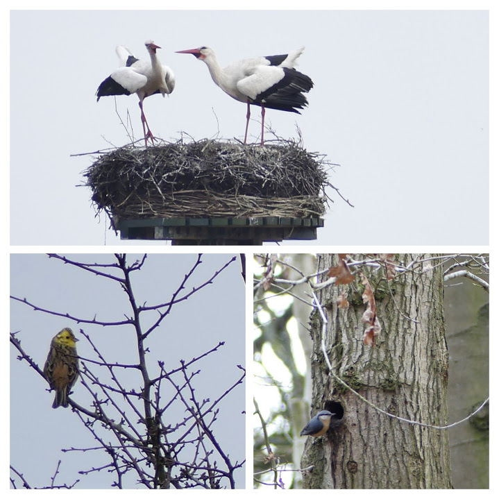 Ze waren bovendien druk aan ’t klepperen. Dat had ik nog nooit gehoord. W. hoorde tot zijn grote blijdschap de Tjiftjaf fluiten. Als de Tjiftjaf terug is in ons land is dat voor W. het teken, dat de lente is begonnen. Ik probeerde de geluiden van de Karekiet, de Lijster en de Koolmees te onderscheiden, maar dat valt niet mee. Wel lukte het me om de Geelgors en de Boomklever op de foto te zetten. Ik heb geen enorme zoomlens, maar vond het zo ook al leuk.