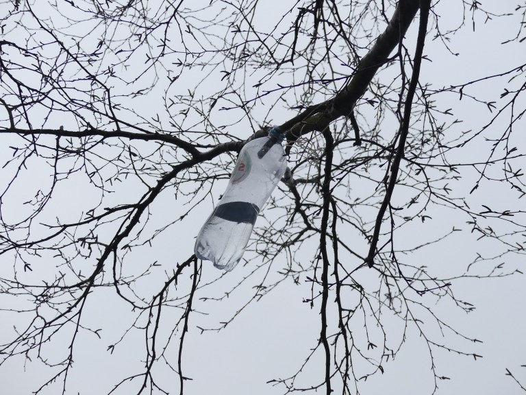In de achtertuin van mevrouw Onkruid hingen plastic flessen in de berkenbomen.