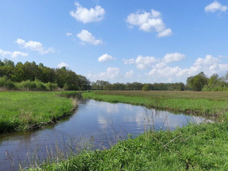 Nu we in Groningen bivakkeren gaan we het Pieterpad in deze omgeving oppakken om te wandelen. Zo’n uitgezette wandelroute vinden we heel fijn om te lopen. We gaan ervan uit dat men ons langs de mooiste plekken stuurt. Uit onze ervaring met andere LAW is gebleken, dat dit meestal wel zo is. Bovendien probeert men ons zoveel mogelijk onverhard te laten lopen. Deze etappe kwamen we weer aardig aan onze trekken. Vanuit Zuidlaren liepen we door het bos naar het stroomdal van de Drentse Aa. Het zonnetje zorgde voor extra schoonheid van dit natuurgebied.