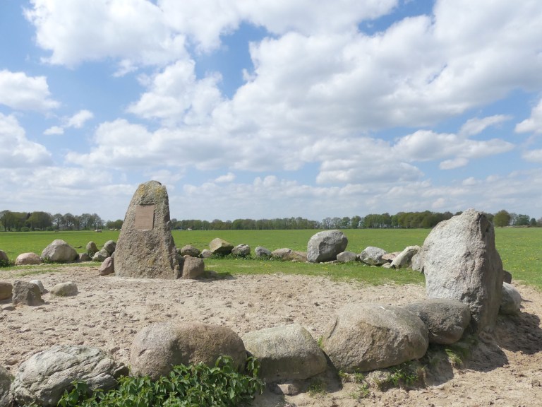 We passeerden nog een kring van stenen, in de sfeer van hunebedden, maar het bleek een soort monument te zijn, voor de Pieterpadlopers met het aantal kilometers erop wat je al gelopen hebt op dat punt en wat je nog hebt te gaan. Ach ja, er moet iets toeristisch aangeplakt worden, blijkbaar.