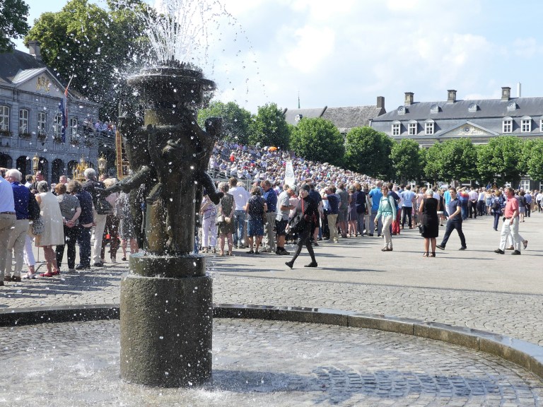 Op een lekkere warme dag is verkoeling heel aangenaam. Ik maakte deze foto op het Vrijthof bij de Heiligdomsvaart. Zeker als je uren in de volle zon hebt gezeten, zou je zo onder die fontein willen gaan staan. Elk spettertje dat je voelt als je er langs loopt, is al heerlijk. Zo zomers!