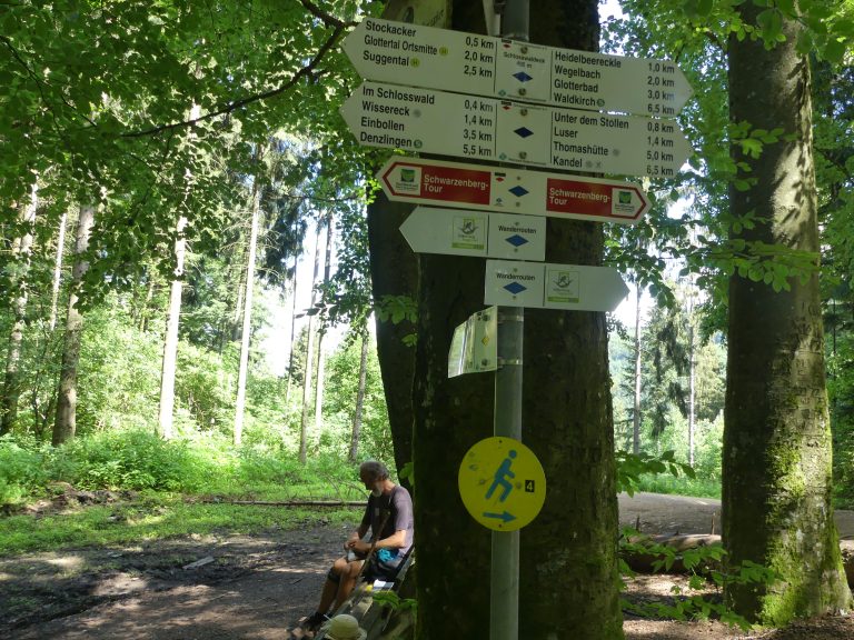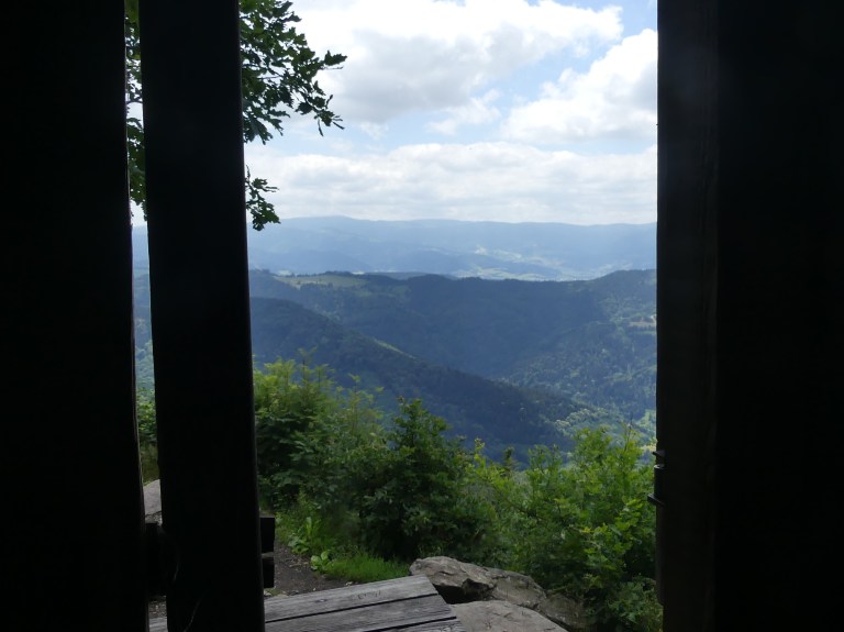 We bereikten de Thomas Hutte. Eindelijk een uitkijkpunt, vernoemd naar een professor, die dit gebied van het Zwarte Woud toegankelijk heeft gemaakt voor wandelaars.