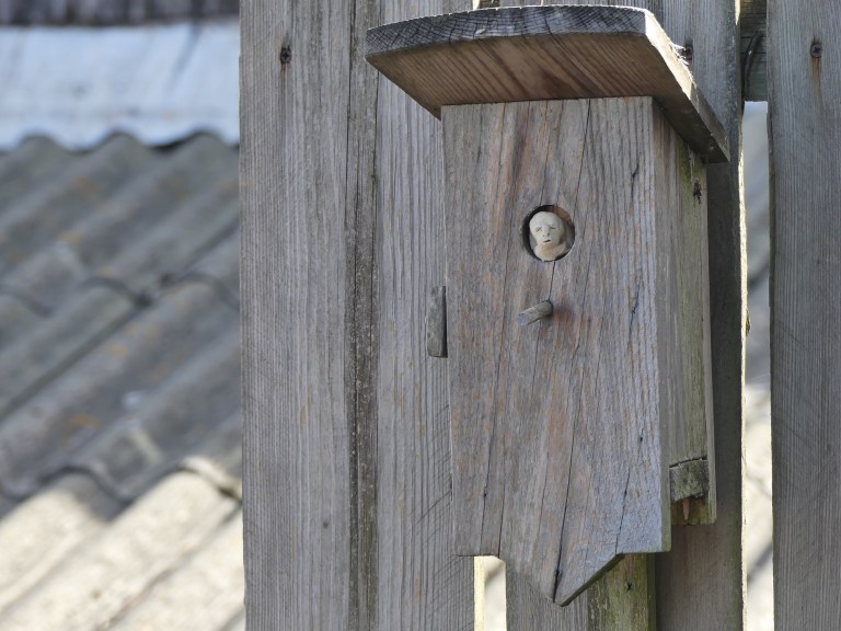 Eindelijk kan ik eens lekker op het terras van het oppashuis zitten, zonder  dat je weggejaagd wordt door de hitte of door de muggen. Valt mijn oog daar op een vogelhuisje met een gezichtje.