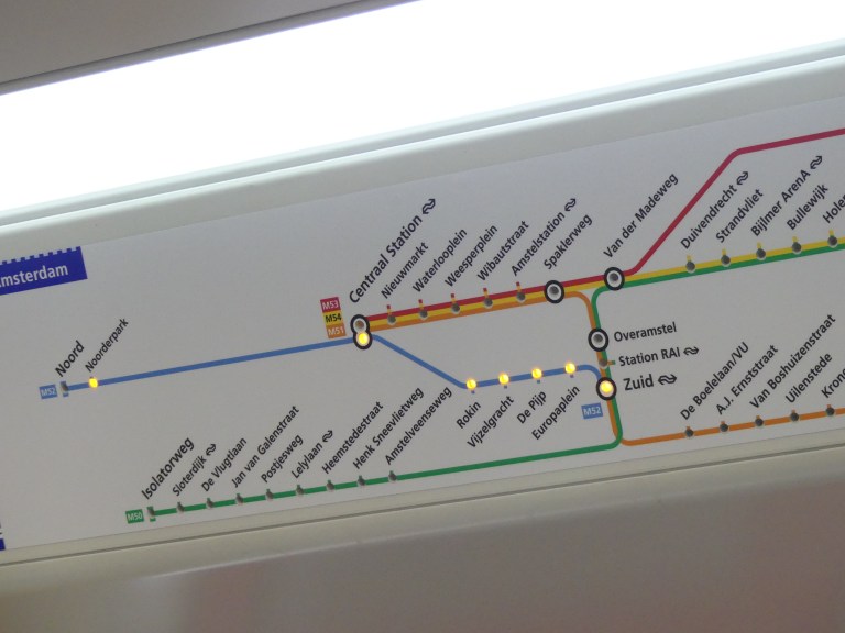 Onze zoon woont in Zuid, dus we hadden een mooi doel om die metro te pakken. We reden mee naar het eindpunt Station Zuid WTC. Binnen een kwartier sta je tussen de hoge kantoorgebouwen. Geen leuke plek om te zijn, dus gingen we met dezelfde metro één station terug en we stapten uit bij Europaplein oftewel de Rai.