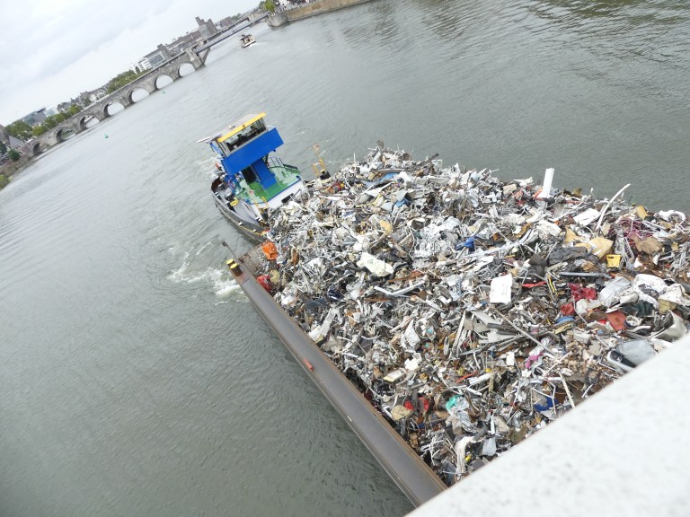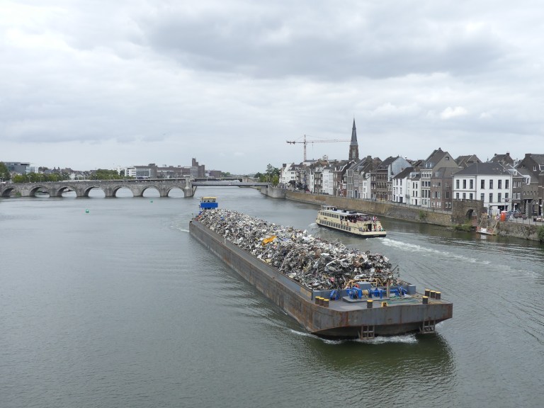 Lopend over de hoge brug in Maastricht zag ik deze grote boot vol afval aankomen varen.